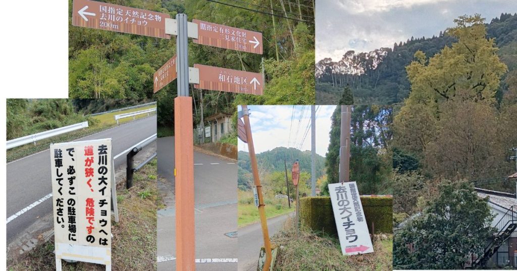 宮崎市市街地方面からは、国道10号線、去川小学校(廃校)の脇(看板あり)を左折して、約500m。狭い道に入りますが、看板通り進めば駐車場に着きます。駐車場から少し歩き大イチョウに着きます。  途中狭い道もあるので、走行には注意してください。