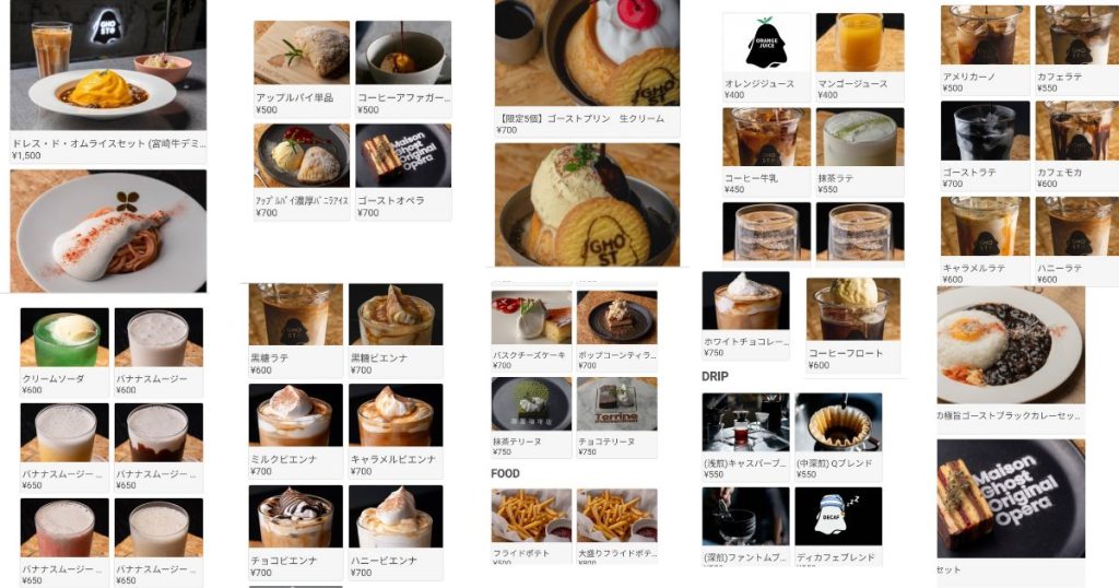 飲み物もいろんな種類があり、どのメニューも美味しそうです。食べ物だけでなく、GHOSTのマグカップ、Tシャツなどのグッツも販売しています。 あと、クッションやブランケットもQRコードで注文し借りることができ、居心地よくゆっくり過ごせます。