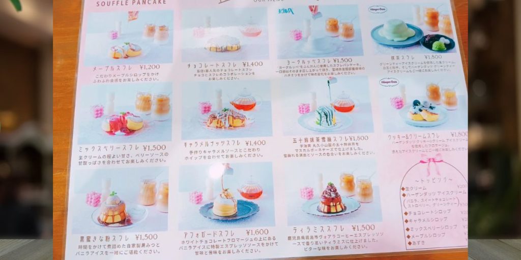 基本のメニュー↑ 他に期間限定メニューもありました。メニューがいろいろあり、迷ってしまいます。トッピングもあるので、自分の好みのパンケーキにできちゃいます。